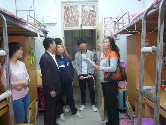 2016年4月24日下午四点,数学与统计公司党总支副书记苗宝军、团总支书记沈会焘,辅导员杜娟以及14级15级的七位班长一起走访本院全部89个员工宿舍,进行宿舍安全卫生检查和宣讲反电信诈骗。